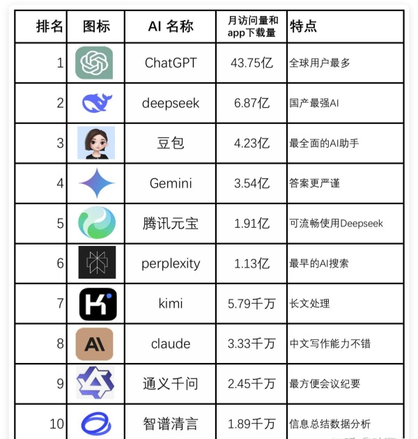 当下各大互联网科技厂商卷的飞起,隔段时间就突破新技术,更新名下AI软件的新版本、新功能,致力于不断完善用户的使用体验。大家熟知的chatgpt,以及国产最强AI deepseek,互动性超强的豆包等等,哪个更好用呢?今天小编就为大家整理了当下最受欢迎的十大AI智能软件,跟着大众走,总没错。