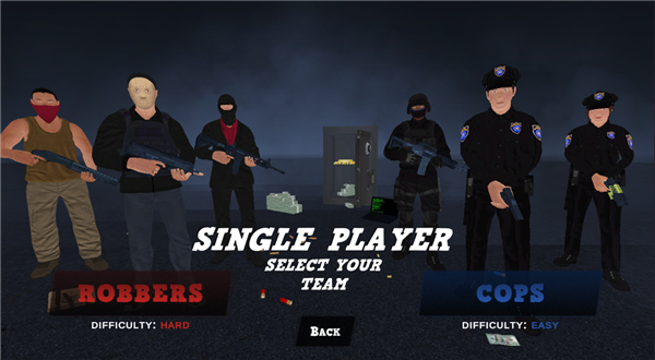 警察和强盗模拟器是RuNix Games推出的一款警匪冒险动作射击手游,游戏中玩家可以选择两个阵营战斗,警察或是匪徒。每个阵营的人物不同,匪徒需要抢劫银行或放下炸药包,成功撤离逃避警察追捕,警察则相反,保护这个城市,阻止匪徒的邪恶计划。游戏玩法多样刺激,模式丰富,射击手感优秀,感兴趣的话下载玩玩吧。
