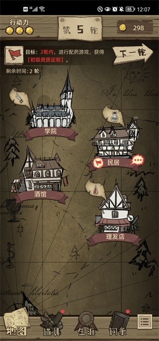 2、首先是地图,理发店、民居、学院、酒馆,分别对应放血治疗、药品配置、截肢手术和人际交互。如果地图上没有,就是剧情还没推进,推进后解锁。