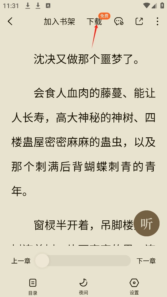 1、选择想要下载的小说后,来到小说阅读界面,点击小说正中间区域即可弹出菜单;