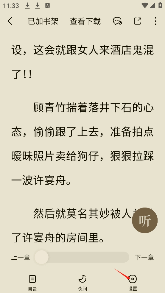 1、来到小说阅读界面,点击小说正中间区域即可弹出菜单,点击设置;