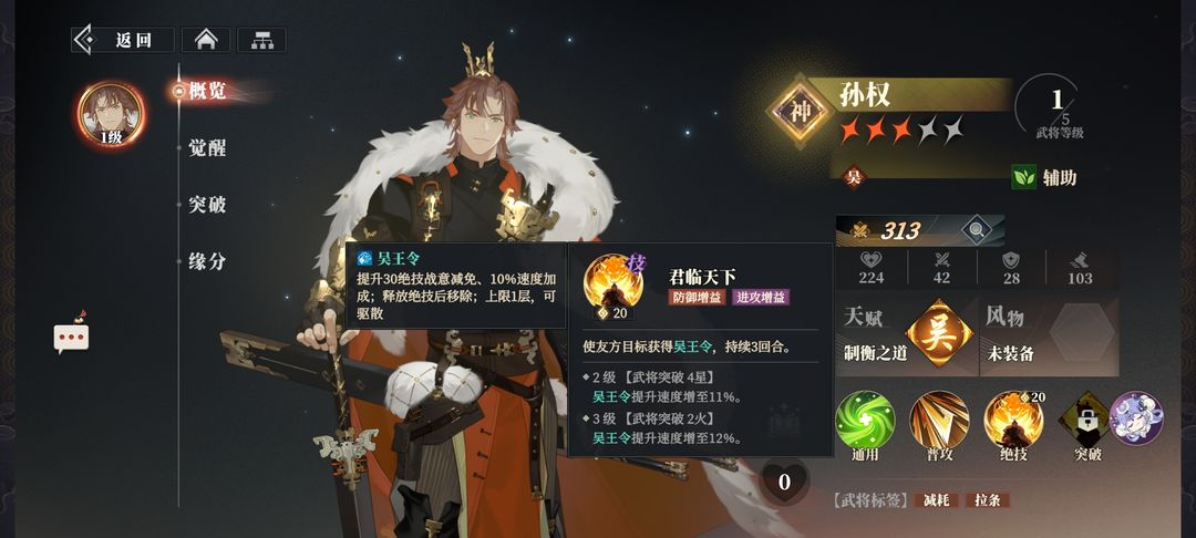 孙权充当团队发动机,大招给队友挂一个“吴王令”的buff,减少目标下次大招30点的战意消耗,并提升10~12%的速度,被动“制衡之道”回合结束给自己挂一个“经略”的buff,达到2~3层的时候,给全队提供一个10%~15的拉条